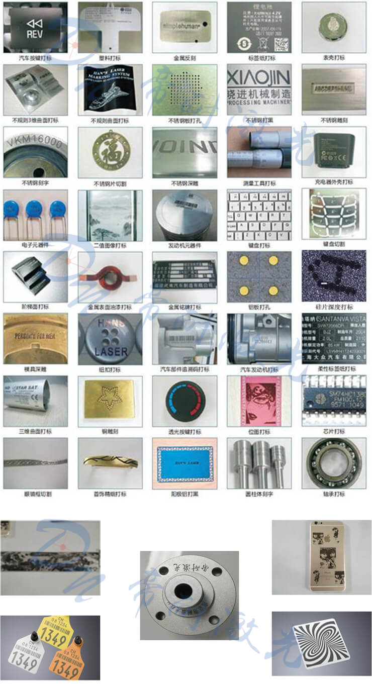 廣泛適用于集成電路芯片、電腦配件、工業(yè)軸承、鐘表、電子及通訊產(chǎn)品、航天航空器件、各種汽車(chē)零部件、家電、五金工具、模具、電線(xiàn)電纜、食品包裝、首飾、煙草以及軍工產(chǎn)品等眾多領(lǐng)域圖形和文字的標(biāo)記,以及大批量生產(chǎn)線(xiàn)作業(yè)。
